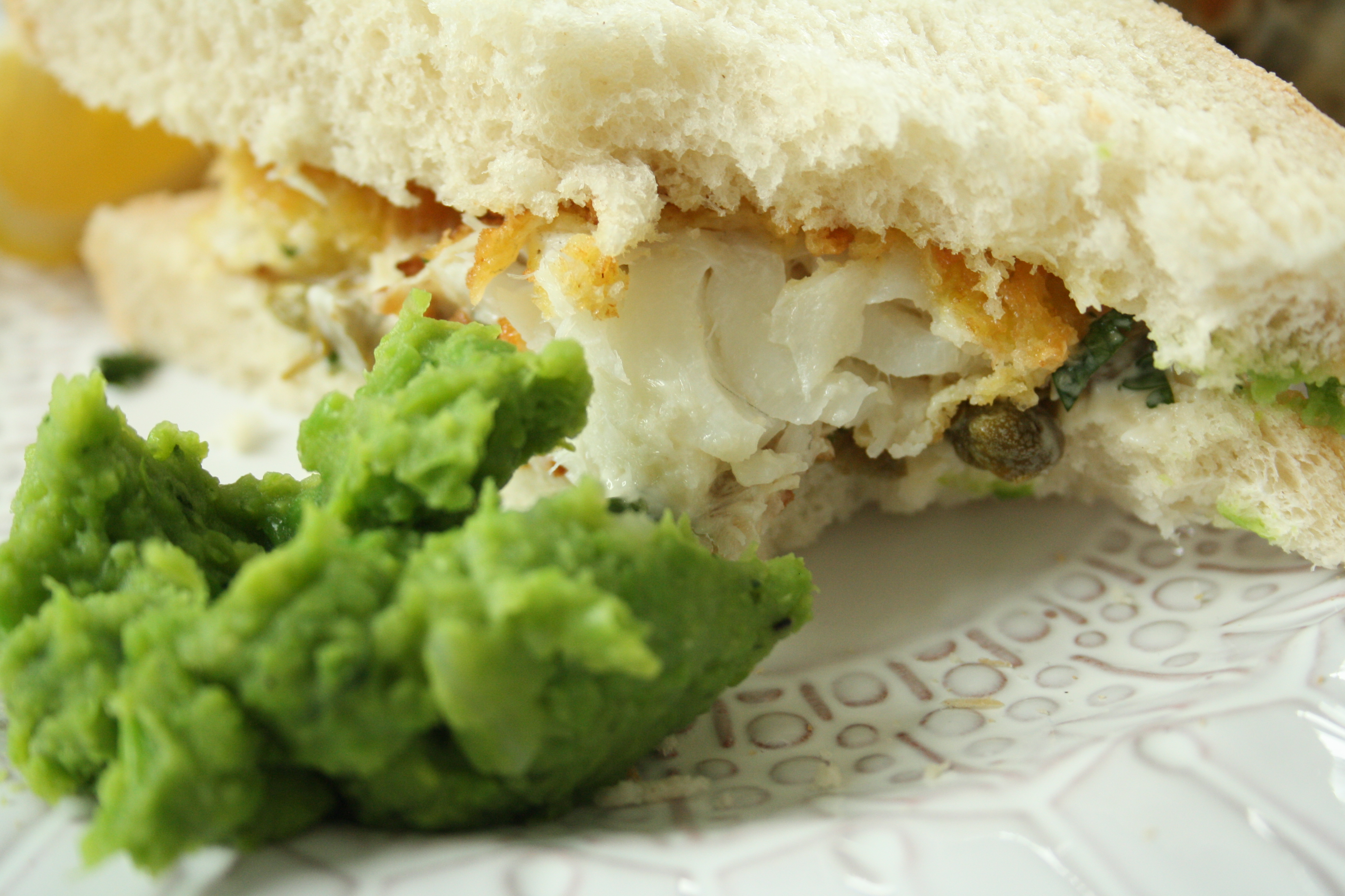 Fish Finger Sandwich with Tartare Sauce and Minted Mushy Peas