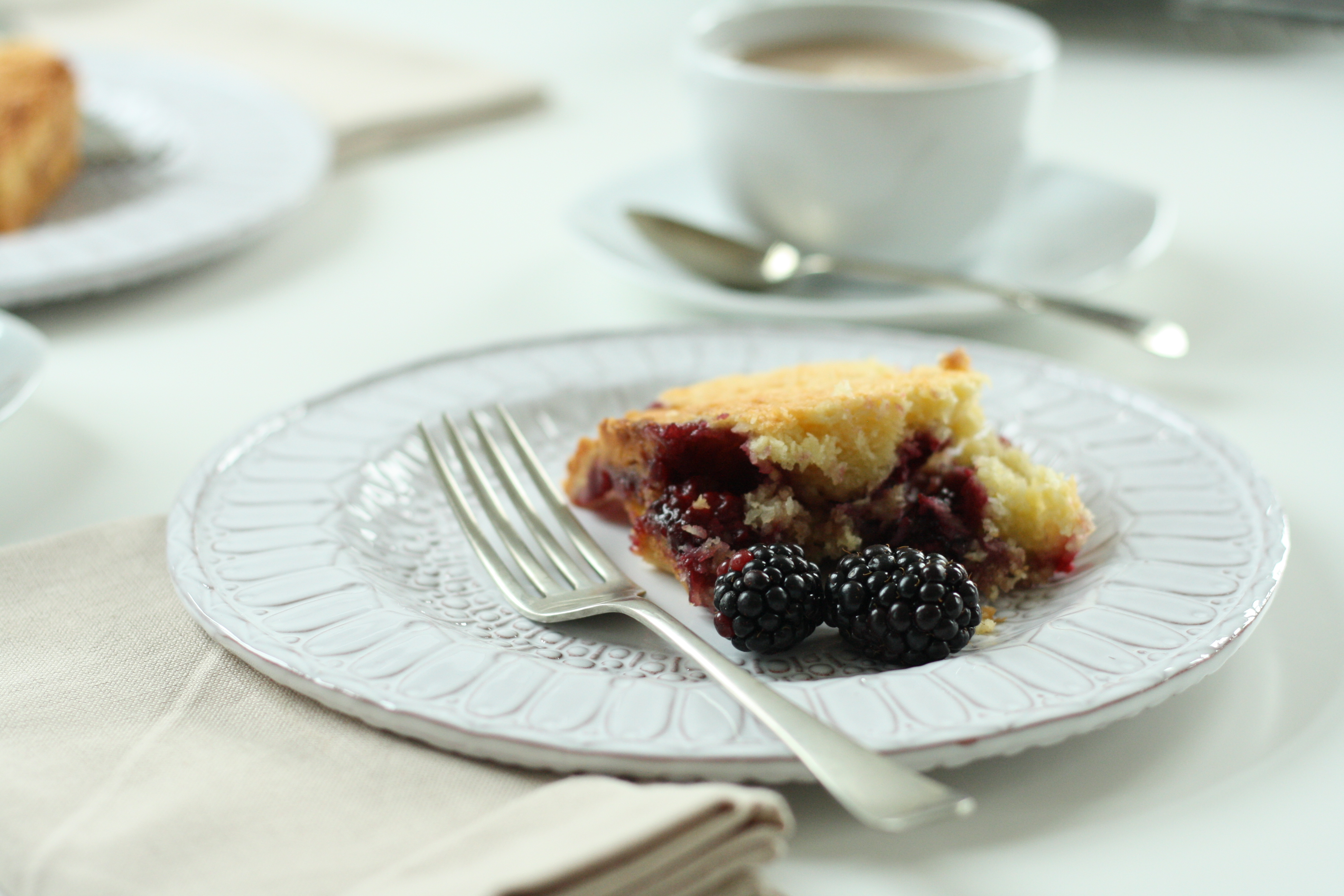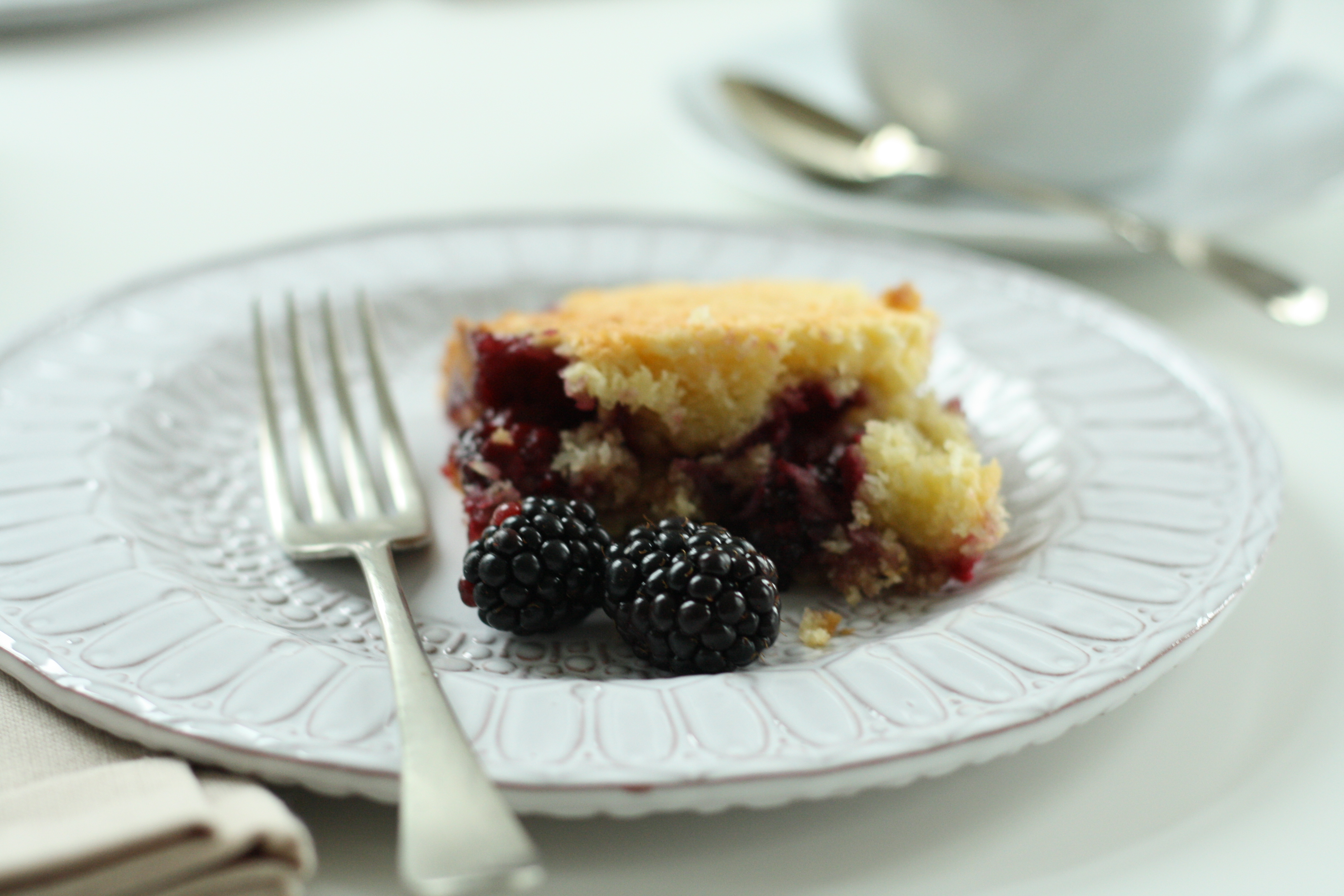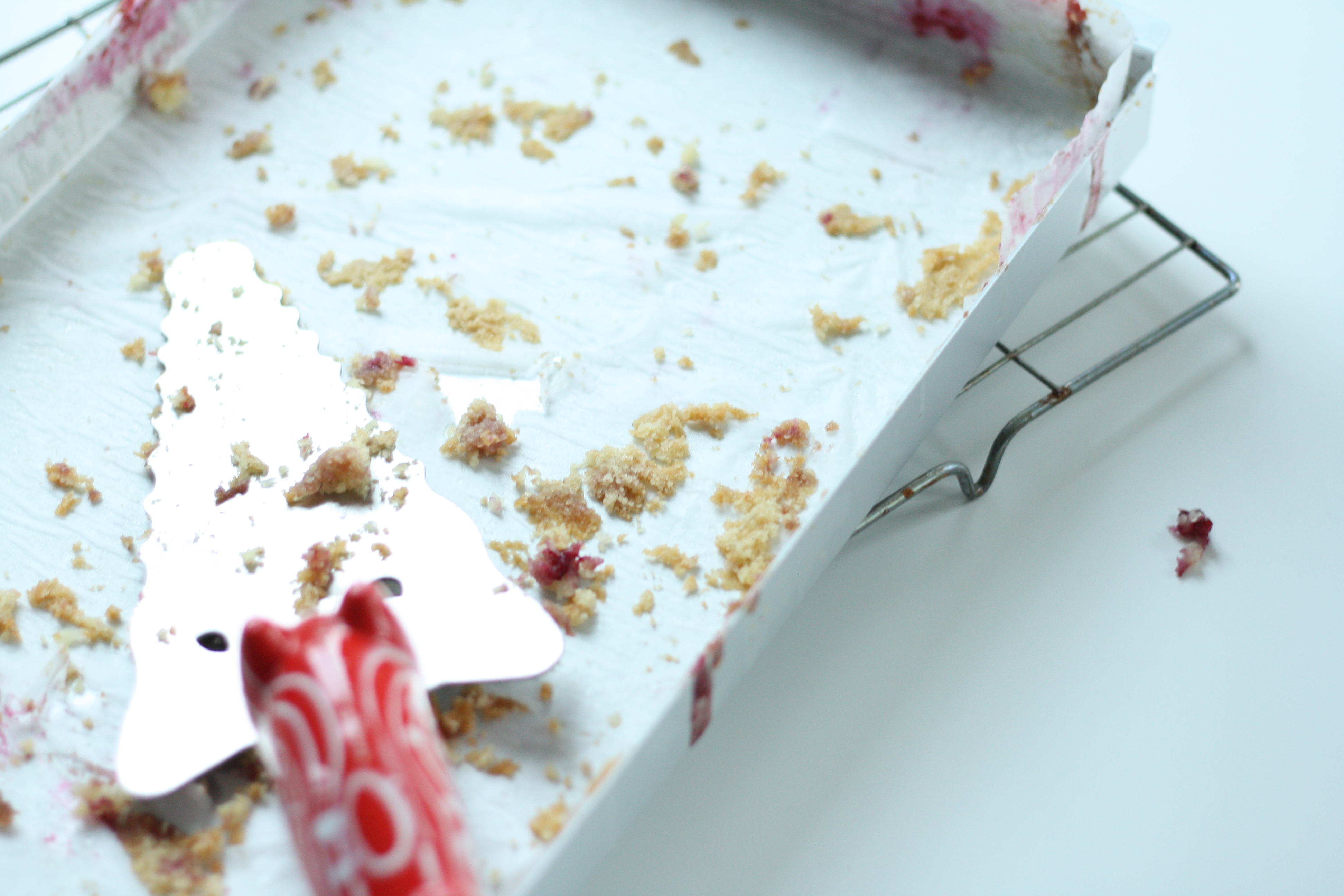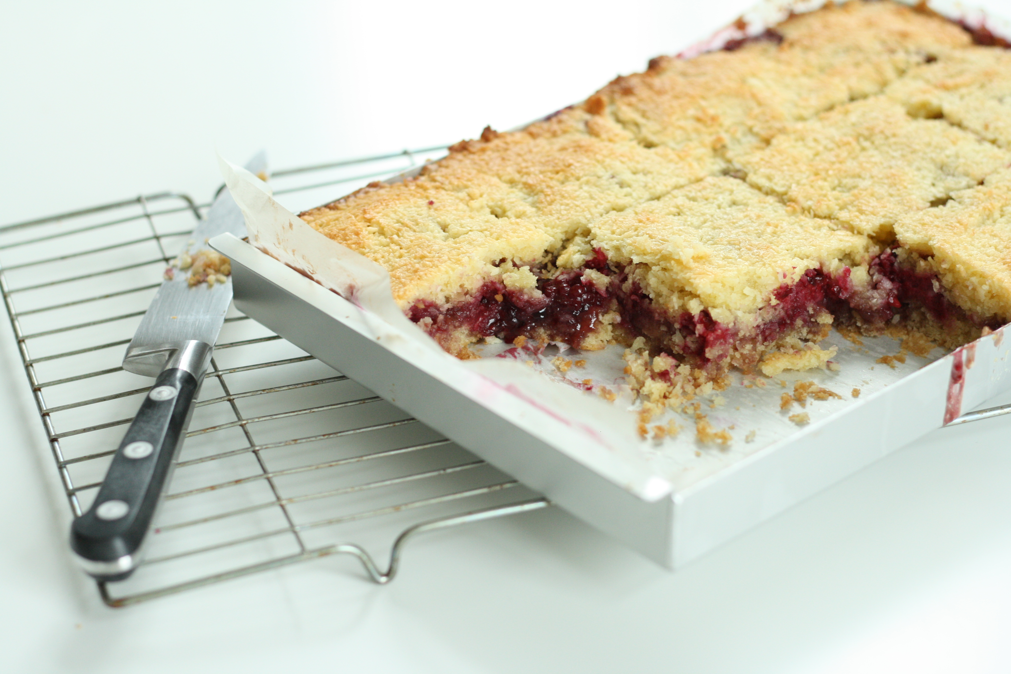 The mess was, however, totally worth it. The only way to describe these slices is like a crunchy topped coconut macaroon, concealing a tangy, sweet layer of blackberry jelly and whole blackberries (we’re talking the British definition of ‘jelly’ here, essentially a wobbly jam with the bits removed) and a moist, vanilla, sponge base. Utterly right in every sense.