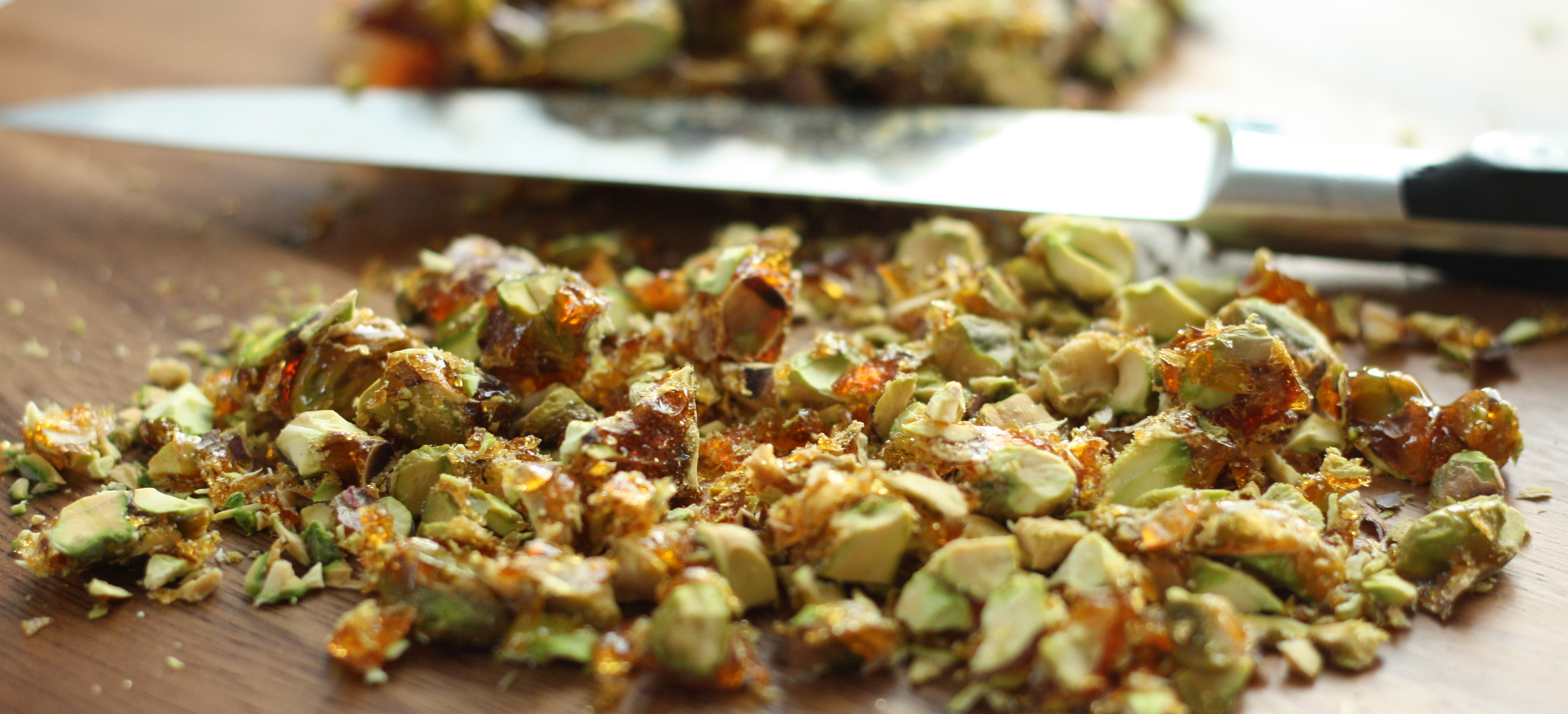 Next heat the caster sugar in a small saucepan over a medium heat until it has dissolved and turned a golden caramel colour. Remove it from the heat, quickly stir in the pistachios and spread it on the parchment to cool. Once cooled, chop it into pieces and store in a airtight container.
