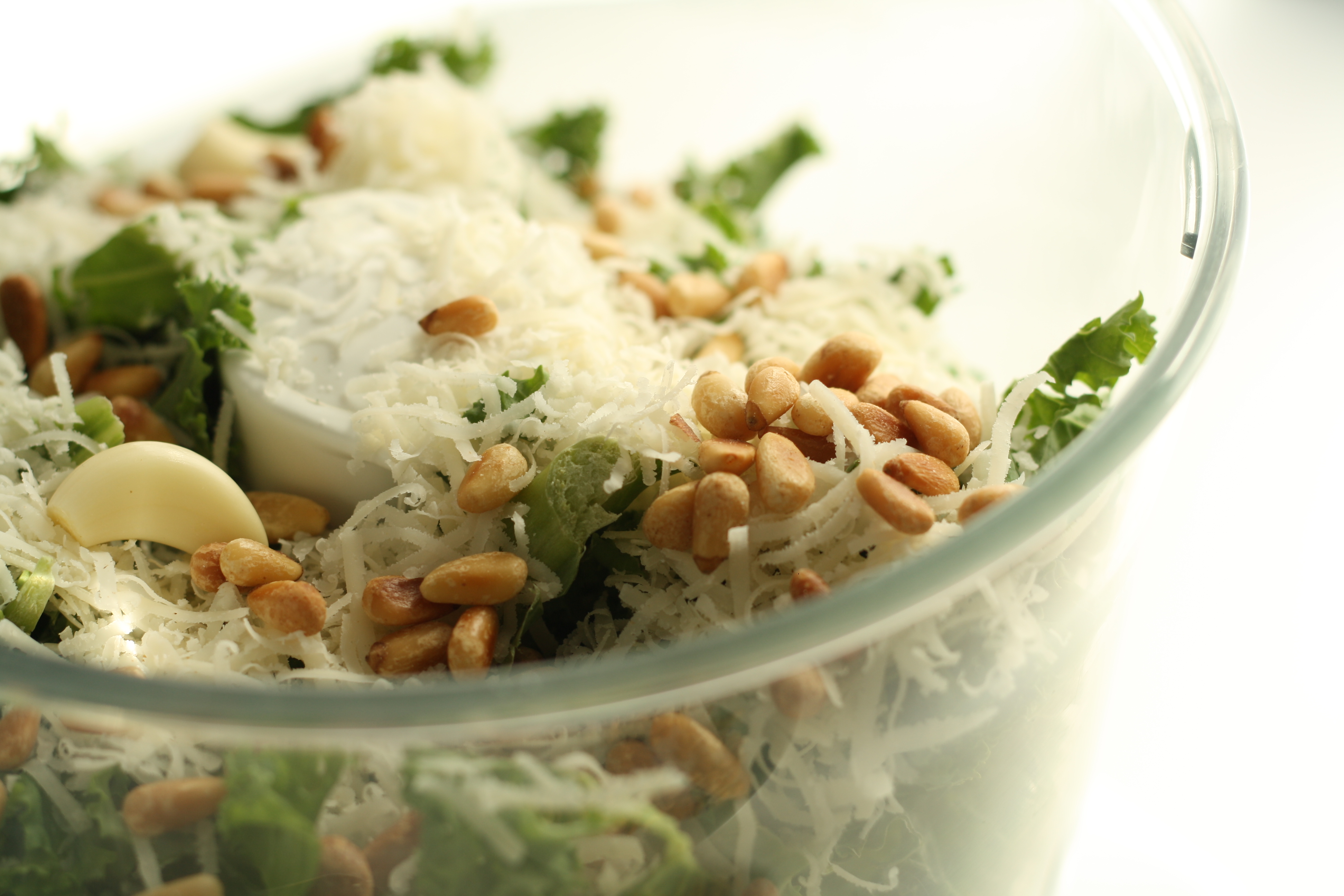 A couple of good handfuls of kale, toasted pine nuts, garlic, rapeseed oil, lemon juice and parmesan are quickly whizzed together.
