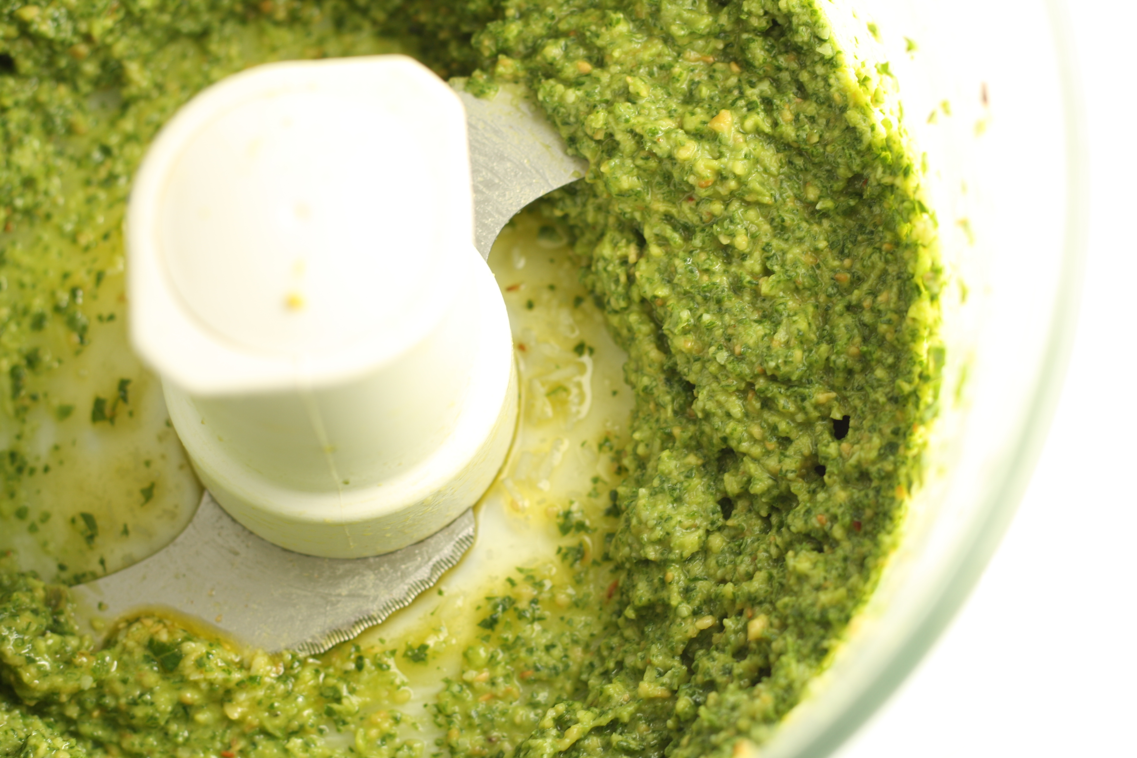 While it’s rising you’ve got the perfect amount of time to whip up the pesto in the food processor.