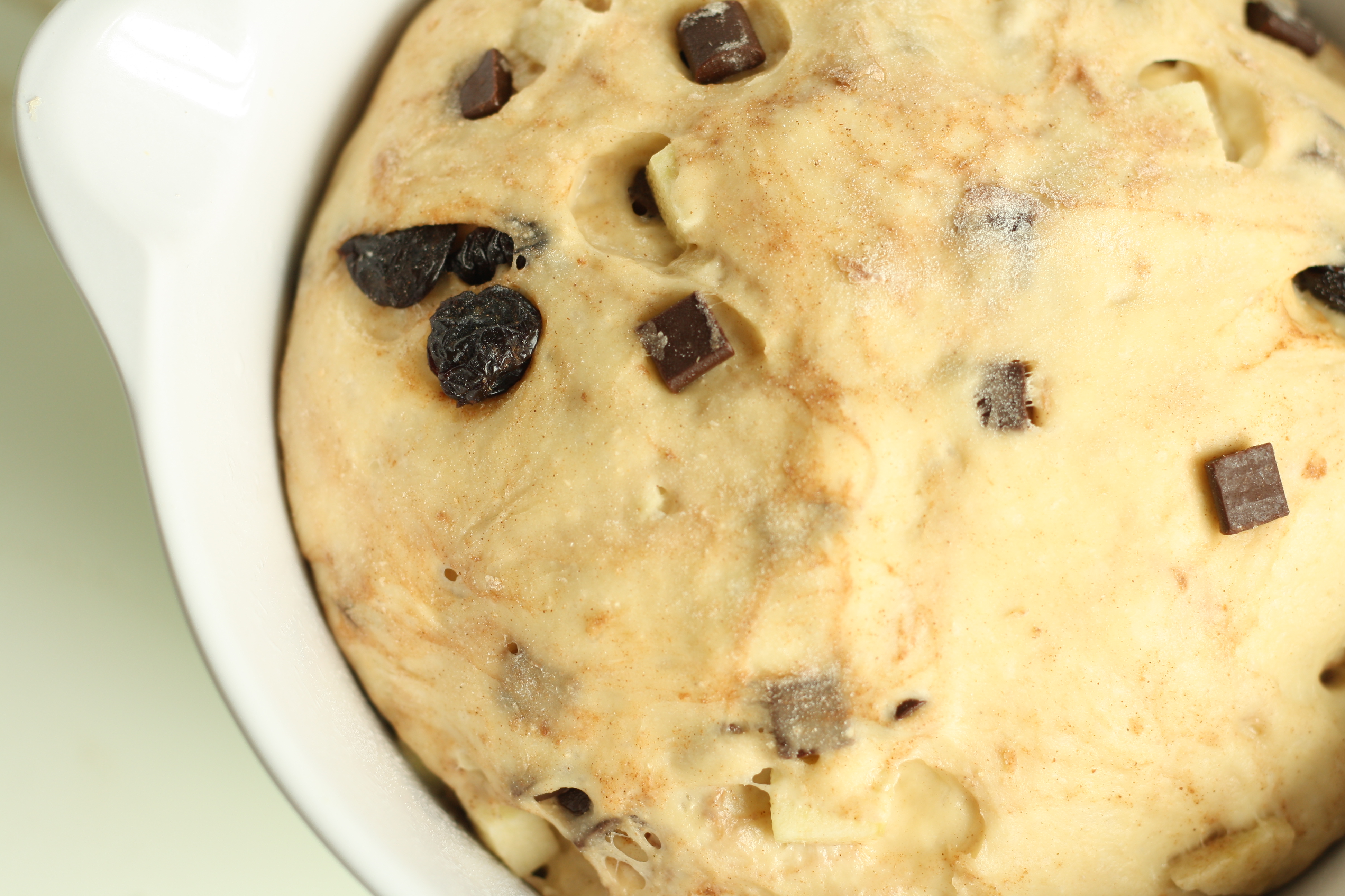Lightly flour a work surface and tip the dough out of the bowl into the flour. Sprinkle over the chocolate, cherries, apple and cinnamon and knead the dough until all of the chunks are incorporated. Put the dough back in the bowl, cover it and leave it to rise for another hour.