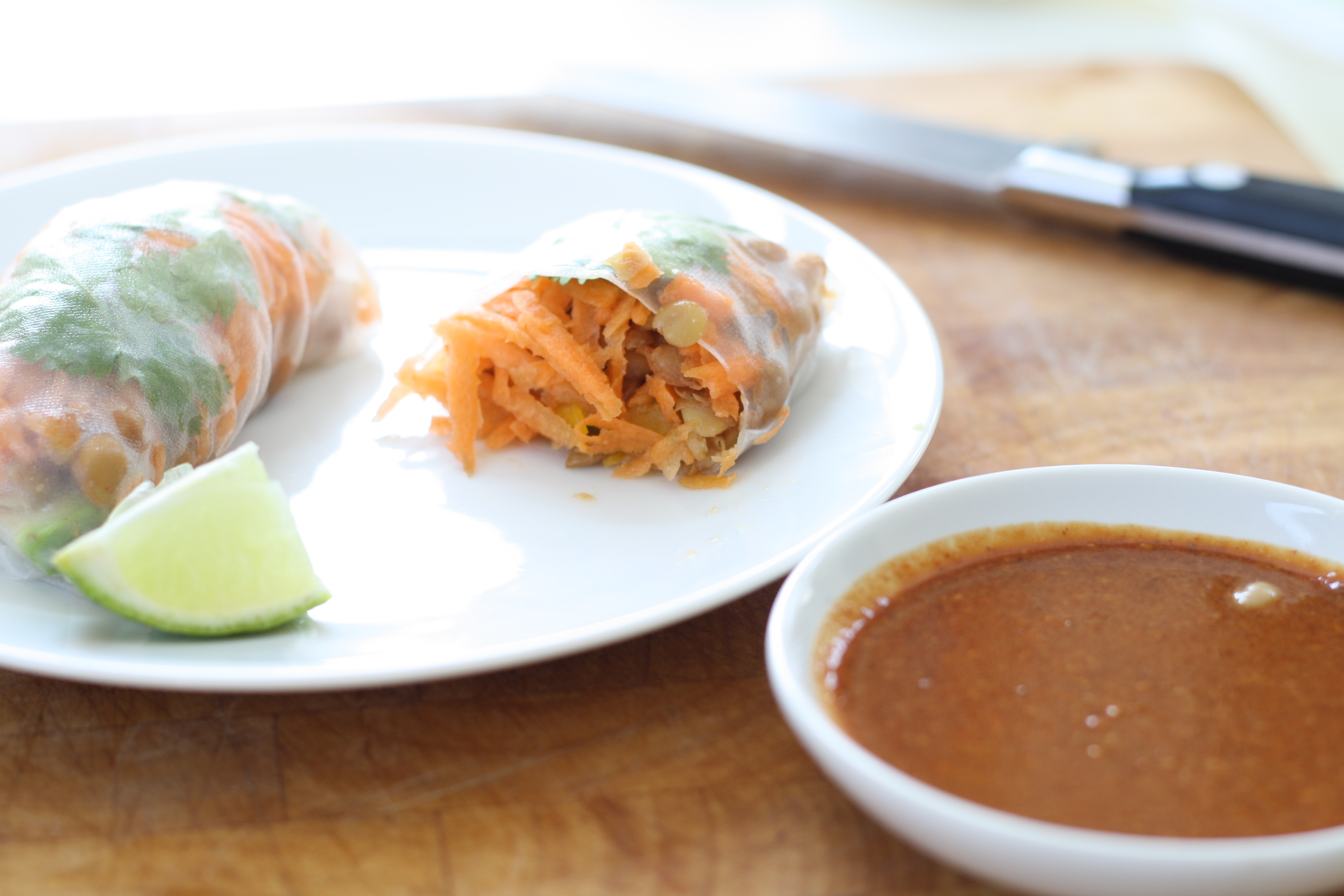 I wanted to pair my rolls up with a spicy dipping sauce and Sara at Sprouted Kitchen suggests a peanut sauce. However, due to a slightly odd peanut phobia (don’t ask), I decided to attempt an almond version instead, adapting a recipe from another amazing blog, Minimalist Baker.